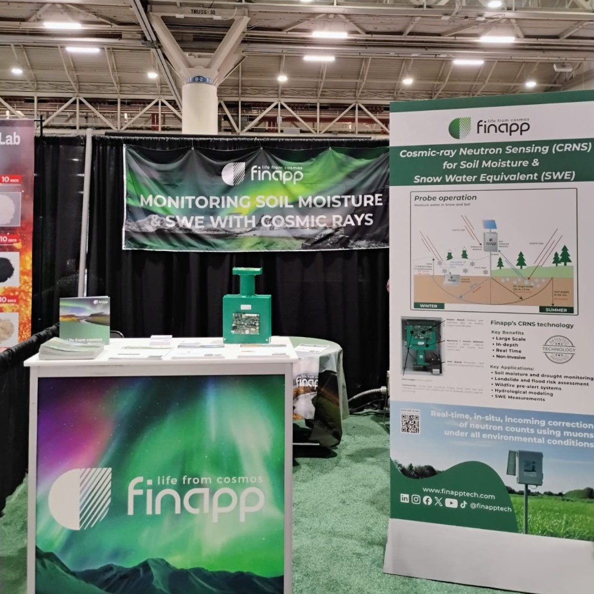 Allo Stand 415, abbiamo presentato la nostra tecnologia CRNS (Cosmic Ray Neutron Sensing), mostrando come le nostre sonde fornissero misurazioni su larga scala, in tempo reale e senza contatto del contenuto idrico del suolo e della neve. I visitatori hanno avuto l’opportunità di vedere la tecnologia in azione e di scoprire come Finapp supportasse una gestione migliore dell’acqua e il monitoraggio ambientale.